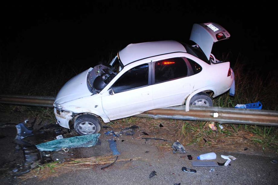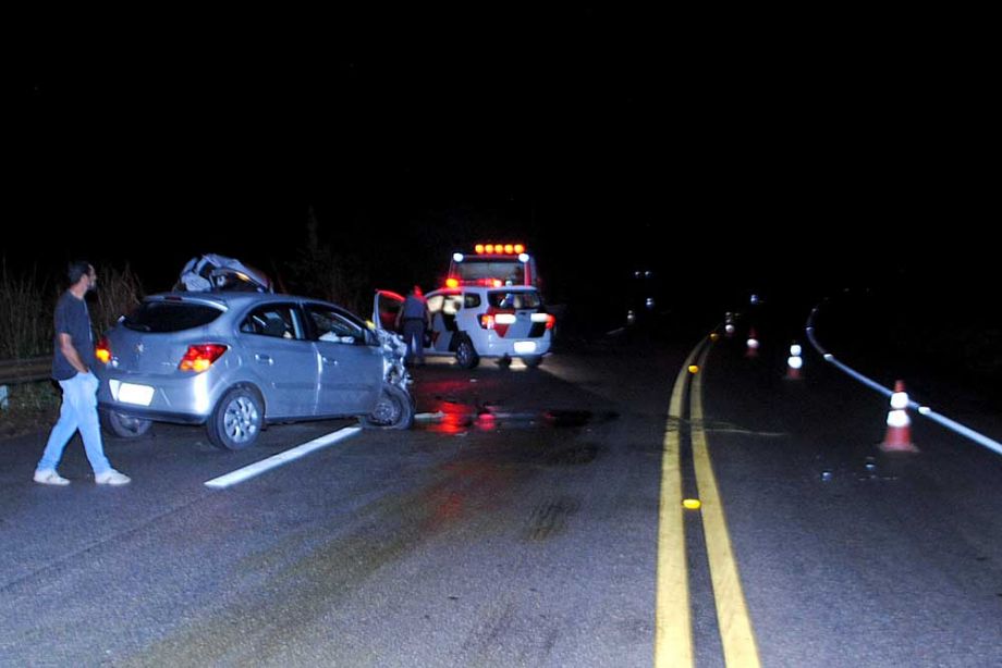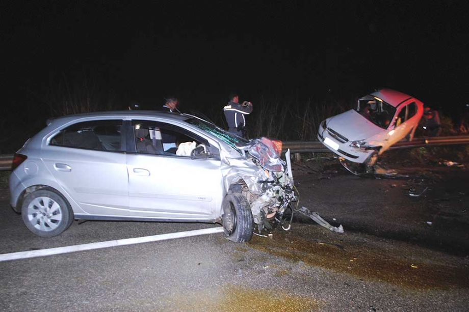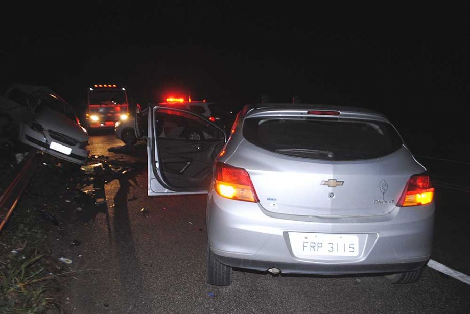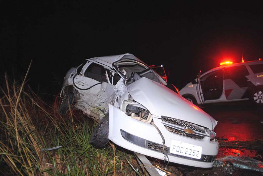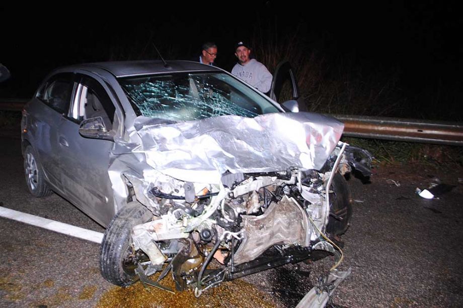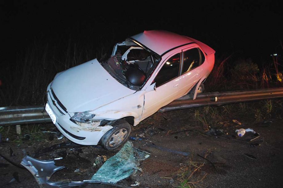 Com o impacto da colisão lateral, o Classic foi parar em cima do guarda lateral (guard rail) e por pouco não caiu numa ribanceira que fica à margem da rodovia.