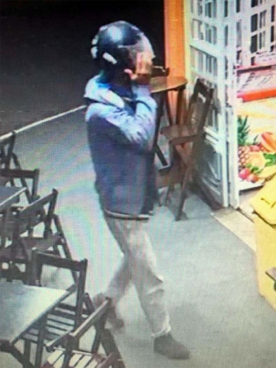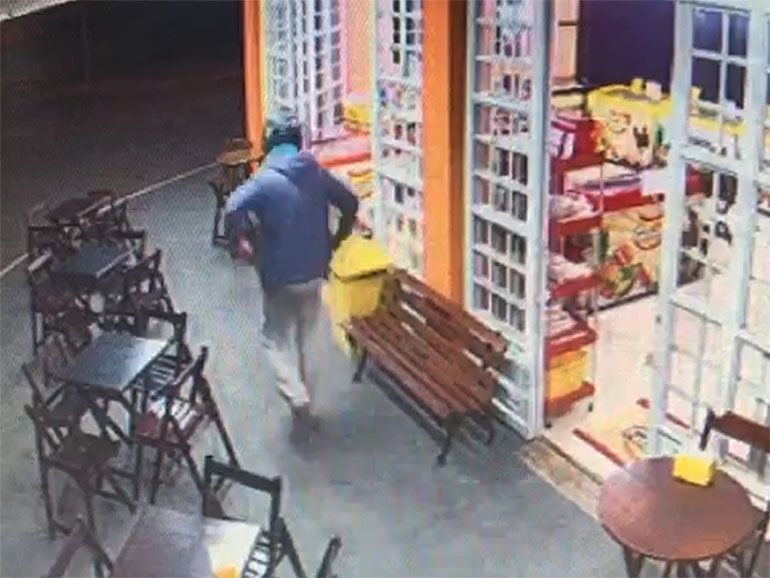 Imagens de câmeras do sistema de monitoramento do estabelecimento mostra dois indivíduos chegando em uma motocicleta vermelha.