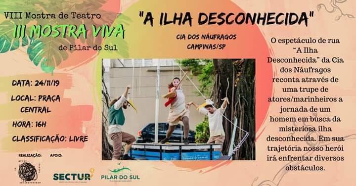 VIII Mostra de Teatro e III Mostra VIVA de Pilar do Sul. O evento, que teve início no dia 1º, traz uma vasta programação artística com espetáculos, shows, exposições e exibições, com artistas de 12 cidades, incluindo artistas locais, regionais e de dois outros estados brasileiros.