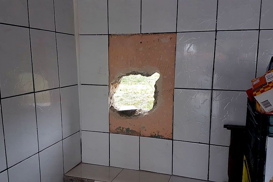Tudo porque ao abrir a pastelaria, que fica em um dos boxes da Praça de Alimentação do Jardim Nova Pilar, eles encontraram o local todo bagunçado e quase não acreditaram ao notar um buraco na parede, que dá fundos para a escola Cida Perches.