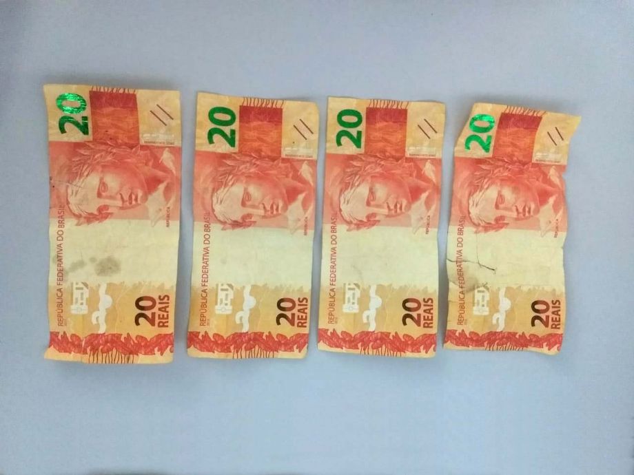 Durante a abordagem ao indivíduo, os PMs Cardena e Osnei localizaram quatro notas falsas de vinte reais, que o rapaz confessou ter adquirido em Sorocaba.