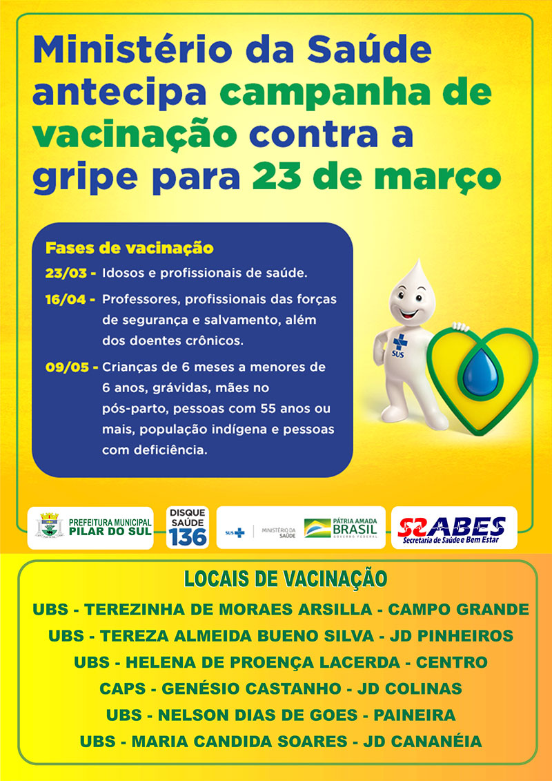 A Prefeitura de Pilar do Sul, por meio da Secretaria Municipal de Saúde e Vigilância Epidemiológica, dará início nesta segunda-feira, 23 de março, a Campanha de Vacinação contra a gripe. A imunização vai assegurar proteção contra três subtipos do vírus de maior incidência: H1N1, H3N2 e Influenza B.