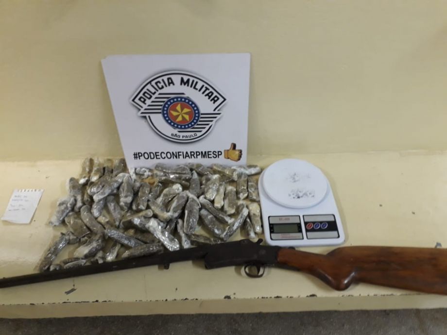 Em buscas no imóvel, os policiais encontraram uma espingarda Rossi, calibre 28, com a numeração raspada, 648 gramas de maconha, embaladas em porções individuais e prontas para a venda, um celular Samsung J5 e uma balança de precisão.