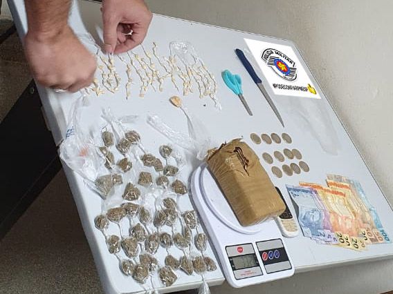 Foram apreendidos um tijolo de maconha pesando 328 gramas, 40 porções de maconha, 109 porções de crack, R$ 333,35 em dinheiro, uma balança de precisão, uma faca de cozinha, uma tesoura, um aparelho celular LG, uma mochila e embalagens.