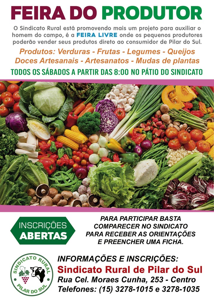 O Sindicato Rural de Pilar do Sul está promovendo mais um projeto para auxiliar o homem do campo, é a Feira Livre do Produtor Rural.