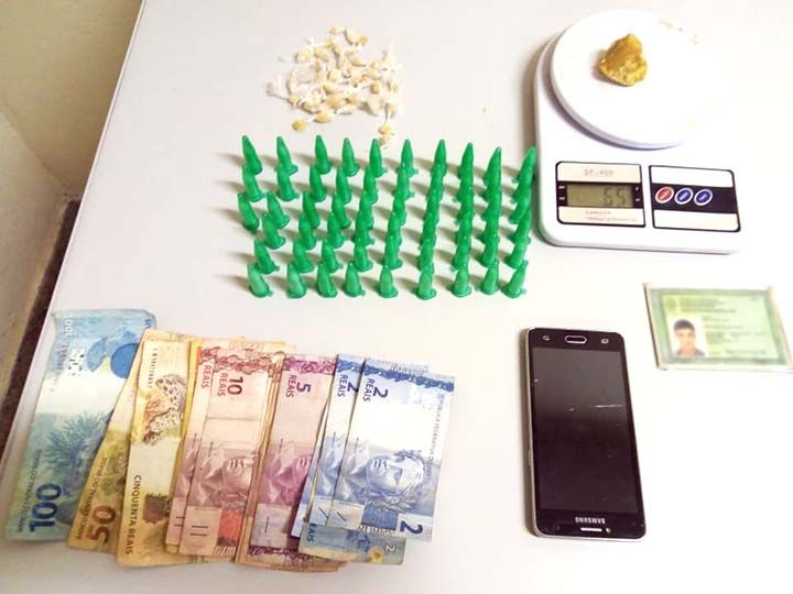 Durante a revista pessoal, os PMs encontraram na mochila de Anderson Nunes Ferreira, 37 anos, 57 pinos de cocaína (98 gramas), uma pedra grande e outras 45 porções pequenas de crack (32 gramas), além de R$ 298,00 em dinheiro e uma balança de precisão.