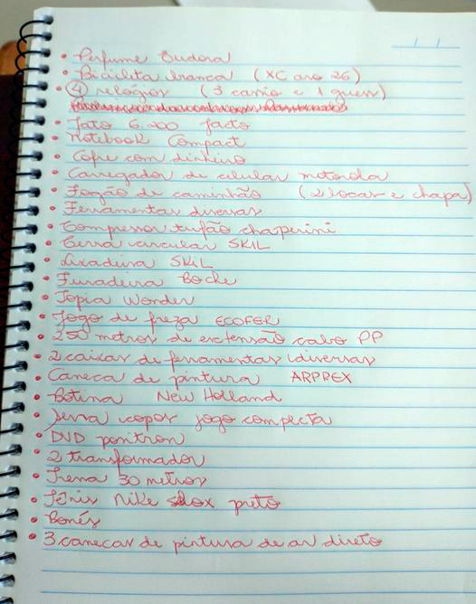 Os ladrões fizeram o limpa na casa. Foram tantas coisas furtadas que as anotações ocuparam toda uma folha de caderno grande