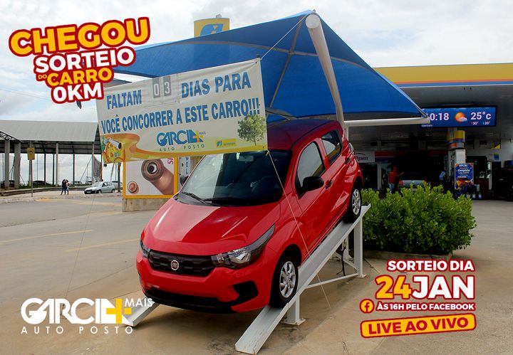 O Garcia Mais Auto Posto realiza neste domingo, 24 de janeiro, às 16 horas, o encerramento da promoção “Complete a Sua Sorte” e o sorteio de um carro Fiat Mobi 0km e cinco vales-combustíveis de 500 cada um!