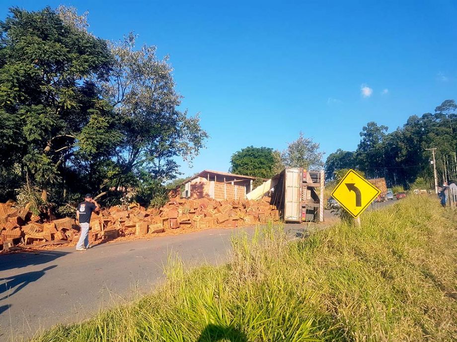 A carga ficou espalhada no acostamento e o tráfego de veículos ficou parcialmente interditado para socorro do caminhoneiro e retirada da carreta, que ostenta placas de Tapiraí.