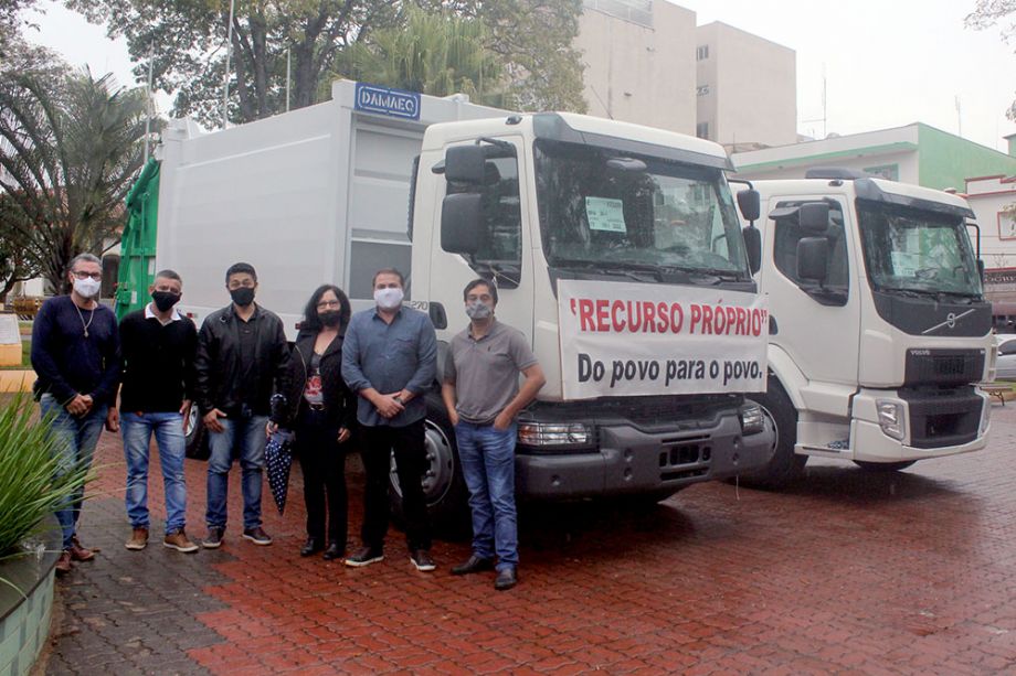 Os vereadores Silvio Yasuda (PSD), presidente da Câmara, Pedrinho Vila Nova (PSD), Toninho Tilico e Cláudia Barros (ambos do DEM) e o vice-prefeito Marcos Fábio (PDT) prestigiaram a entrega dos caminhões.