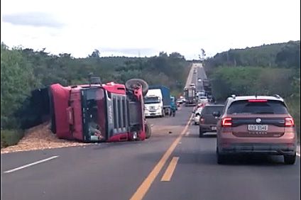 Com a violência do impacto, o carro capotou e ficou com as quatro rodas para cima, enquanto que o caminhão tombou, espalhando a carga no acostamento.