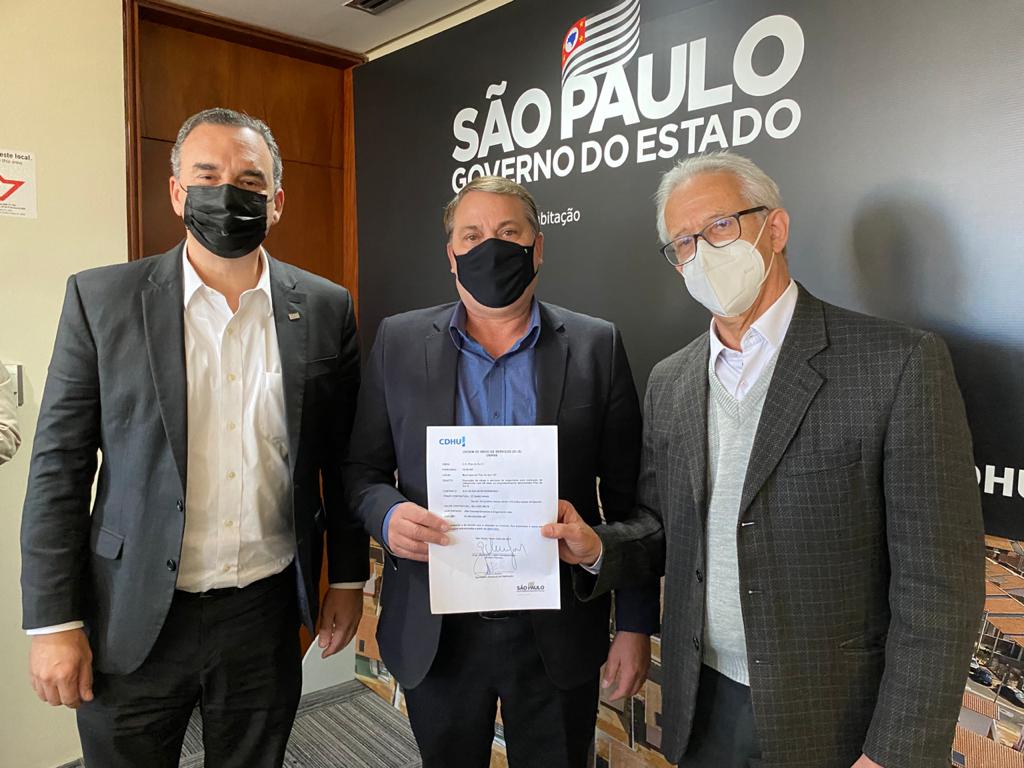 A solenidade aconteceu dia 19 de julho na Secretaria de Estado da Habitação, em São Paulo, com as presenças do secretário de Estado da Habitação, Flavio Amary, do diretor Técnico da CDHU, Aguinaldo Quintana, do prefeito Marquinho da Autoescola e do deputado Edson Giriboni (PV).