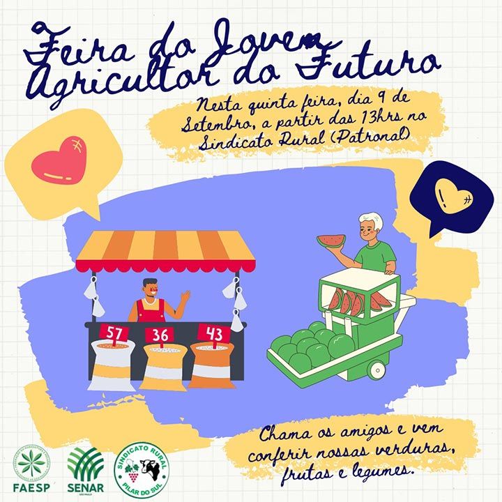 O Sindicato Rural de Pilar do Sul convida a todos para prestigiarem a Feira do Jovem Agricultor do Futuro que será realizada nessa quinta-feira, 9 de setembro, a partir das 13 horas, no pátio do sindicato.