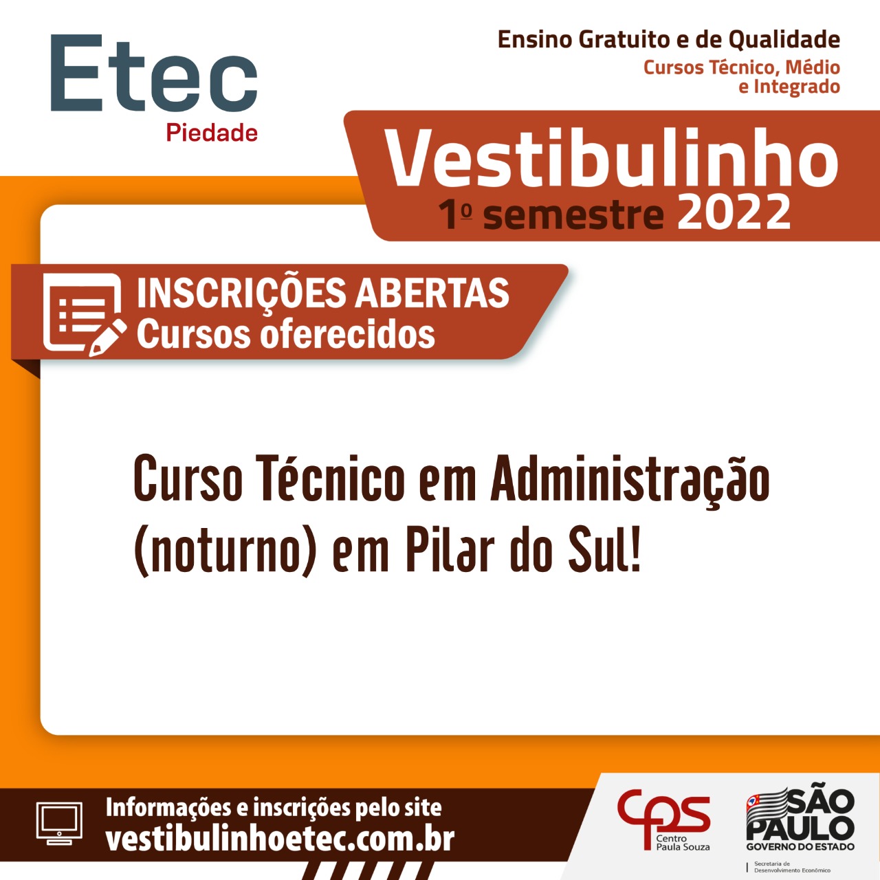 A Etec de Piedade e sua extensão na cidade de Pilar do Sul (EMEF Profª Hilda Holtz de Carvalho), estão com inscrições abertas para o Vestibulinho do primeiro semestre de 2022.