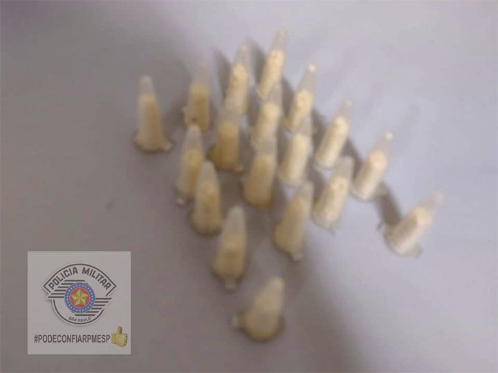 No início da madrugada desta quarta-feira (17) os soldados Joaquim e Alex realizavam patrulhamento pela Rua João Batista de Carvalho, no Jardim Nova Pilar III, local já conhecido pelos policiais pela incidência de tráfico de drogas, quando perceberam um indivíduo em atitude suspeita. Durante a abordagem, os PMs localizaram com ele 17 dezessete frasconetes de cocaína.