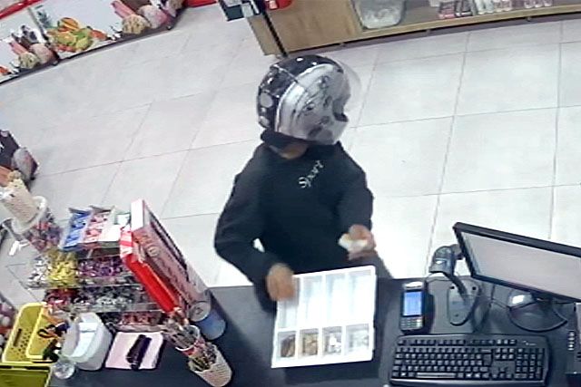 O ladrão que adentrou a sorveteria trajava calça jeans, blusa preta escrita 'Sport', calçado preto e capacete cor prata, com detalhes em preto.