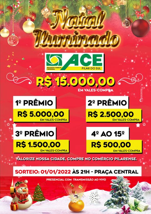 A tradicional promoção de Natal da Associação Comercial de Pilar do Sul sorteará esse ano um total de R$ 15.000,00 em prêmios, distribuídos em 15 vales-compra, sendo o prêmio principal de R$ 5 mil. Serão sorteados ainda um vale-compra de R$ 2.500, outro de R$ 1.500 e doze prêmios de R$ 500 cada.