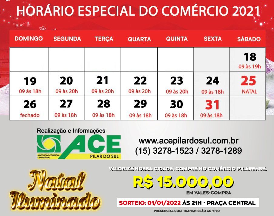 Na semana do Natal (dias 20, 21, 22 e 23) o comércio estará de portas abertas sempre das 9h às 20 horas e no dia 24, véspera do Natal, o funcionamento se dará das 9h às 18 horas.