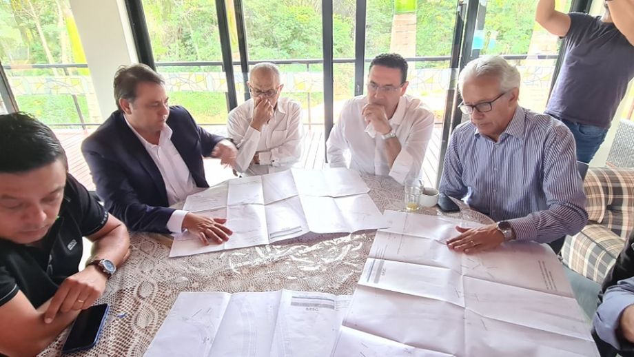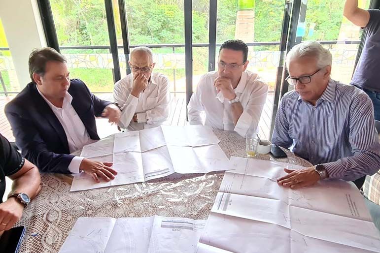 Prefeito Marquinho apresentando o projeto da obra a Antonio Ayub, a Vitor Lippi e a Edson Giriboni