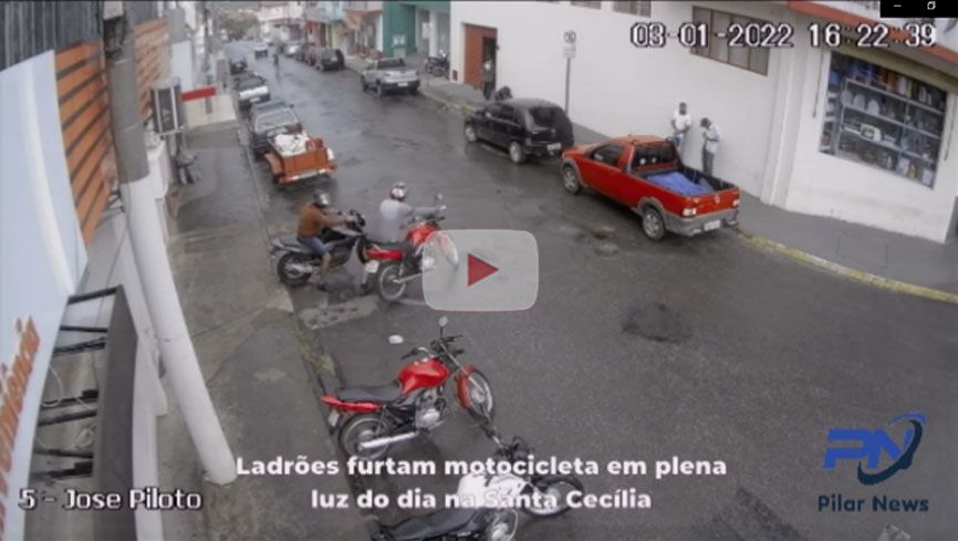 O furto, em plena luz do dia, foi flagrado por uma câmera de monitoramento e mostra quando os ladrões chegaram em uma outra motocicleta preta, encostam ao lado da moto da vítima e rapidamente a levam embora.
