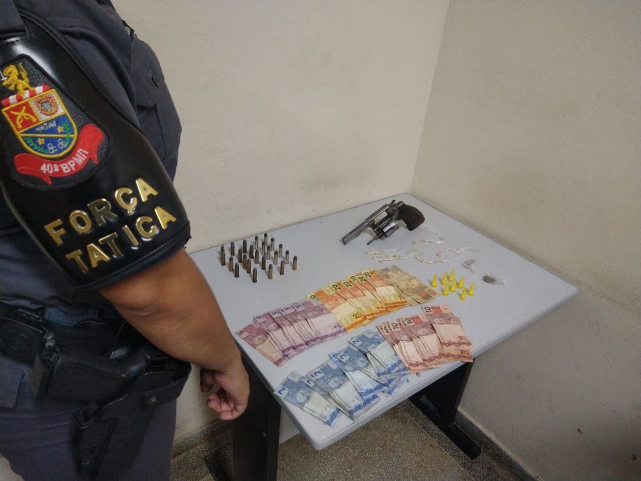 No interior da casa, os policiais localizaram um revólver Taurus calibre 38, com numeração raspada, 24 munições de mesmo calibre, duas porções de maconha, oito frasconetes de cocaína, 28 pedras de crack e R$ 560 em dinheiro.