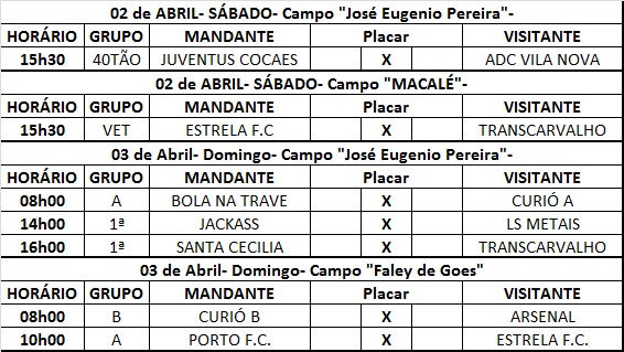 A rodada teve início no sábado (26) com Os Velhinhos goleando o Galo Forte pela categoria veterano por 4 a 1.