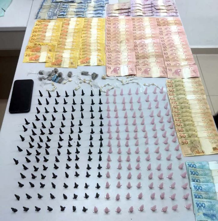 Durante a revista pessoal, os PMs localizaram em sua posse um total de 245 frasconetes de cocaína, 39 pedras de crack e 12 porções de maconha, além de R$ 2.690 em dinheiro.