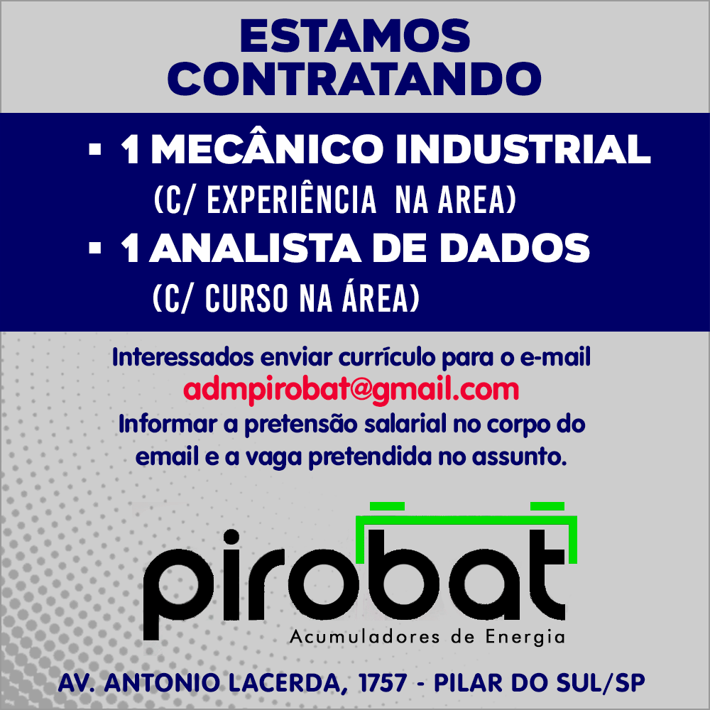 A PIROBAT - empresa líder na produção de baterias automotivas, está admitindo para início imediato: