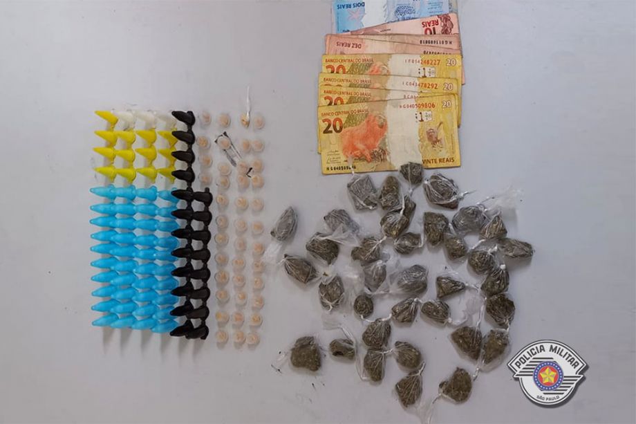 Foram apreendidos 76 frasconetes de cocaína, 40 pedras de crack e 36 porções de maconha, com peso total de 256,9 gramas de drogas e R$ 124 em dinheiro.