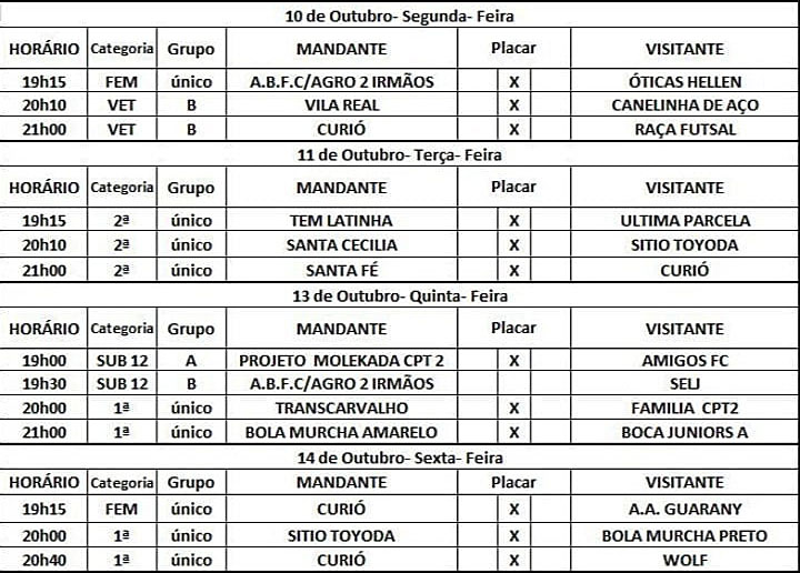 A rodada será aberta com dois jogos da categoria de base entre Projeto CP2 e Amigos FC pelo grupo A. No grupo B, a ABFC/Agro 2 Irmãos enfrenta a SELJ.