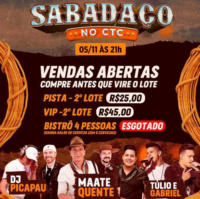 Nesse sábado, 5 de novembro, terá um sabadaço incrível no CTC (Centro de Tradições Campeiras) de Pilar do Sul com shows, prova dos 3 tambores e muitas novidades.