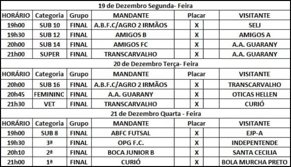 Na final do sub-10, ABFC/Agro 2 Irmãos e SELJ se enfrentam. Em seguida Amigos A e Amigos B disputam a final do sub-12. E no sub-14, Guarany e Amigos FC duelam pelo título.