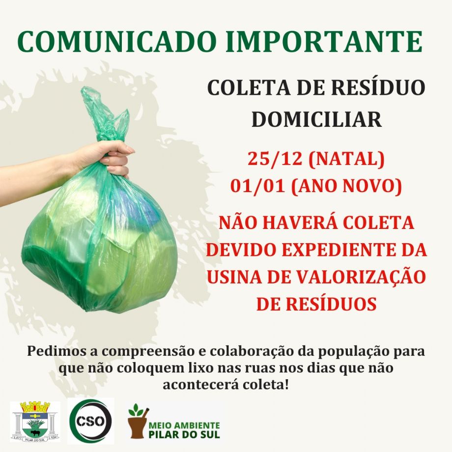 A Prefeitura de Pilar do Sul, por meio da Secretaria de Desenvolvimento Rural e Meio Ambiente (SEDRUMA), informa a população que nos feriados de Natal, segunda-feira (25), e de Ano Novo, segunda-feira, 1° de janeiro, não haverá coleta de lixo no município.