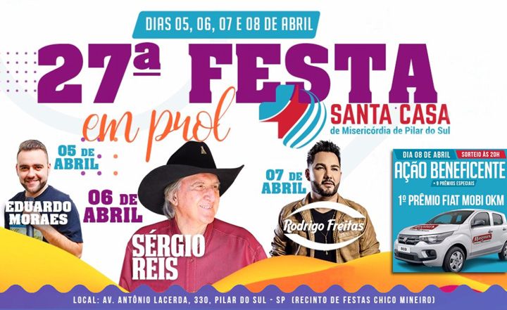 O cantor sertanejo Sérgio Reis será a atração principal da 27ª Festa da Santa Casa que será realizada entre os dias 5 e 8 de abril no recinto Chico Mineiro em Pilar do Sul, com entrada será franca.