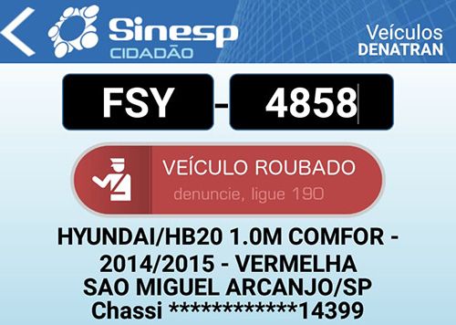 O carro furtado é Hyundai HB20 vermelho, placas FSY-4858 (São Miguel Arcanjo)