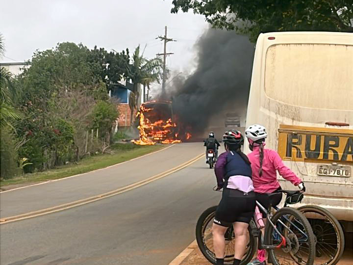 O veículo, que transportava estudantes da linha do bairro Pinhal de Cima, foi completamente consumido pelas chamas.