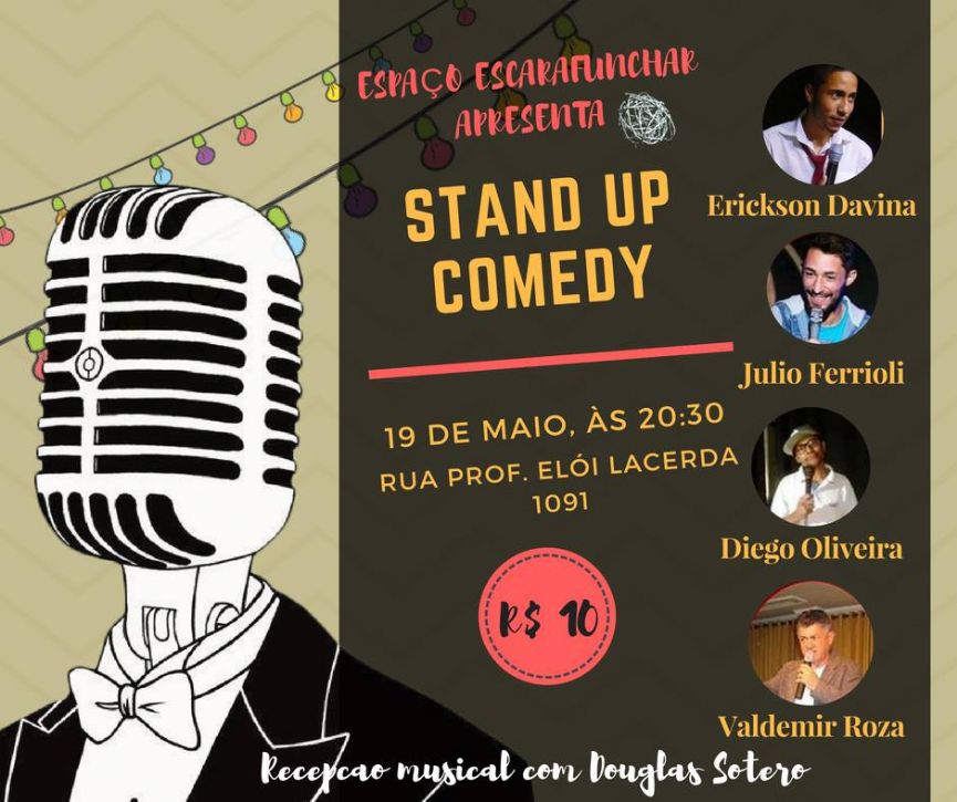 O Grupo de Teatro Escarafunchar promove neste sábado (19), a partir das 20h30, um espetáculo de stand up comedy com os artistas Erickson Davina, Julio Ferrioli, Diego Oliveira e Valdemir Roza, um show de comédia que terá a participação musical do cantor Douglas Sotero.