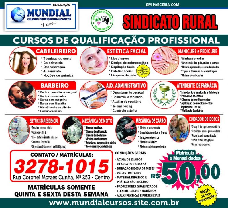 apenas R$ 50 e a taxa de inscrição de R$ 50. São apenas 12 vagas por curso!