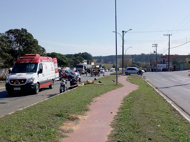 Três pessoas ficaram feridas em um acidente entre carro e motocicleta no início da tarde desta sexta-feira (29) em frente ao prédio do INSS (Previdência Social) no Jardim Nova Pilar.
