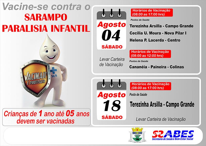 A Secretaria de Saúde de Pilar do Sul realizará neste sábado (18) a segunda etapa de vacinação contra o sarampo e paralisia infantil (poliomielite) para crianças com idades entre 1 ano e 4 anos, 11 meses e 29 dias.