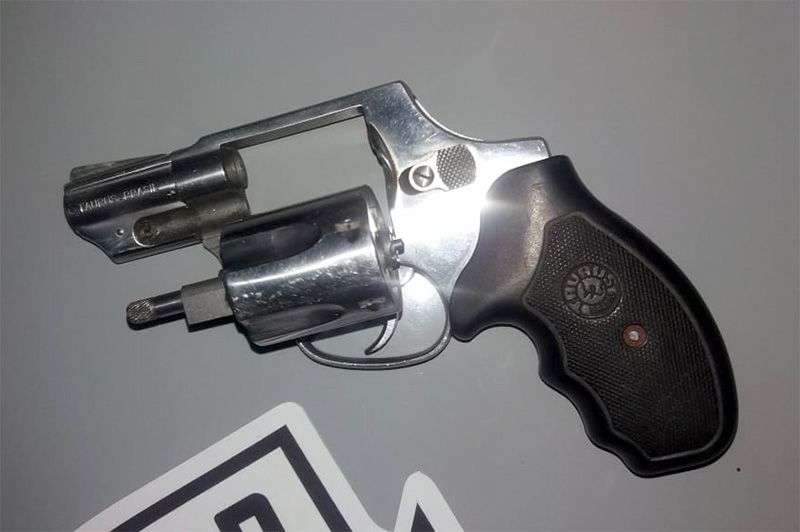 De volta ao terreno, já com os apoios do sargento Rossi e do cabo Vieira, os policiais localizaram o objeto dispensado, um revólver marca Taurus, calibre 38, com numeração raspada e 5 munições intactas.