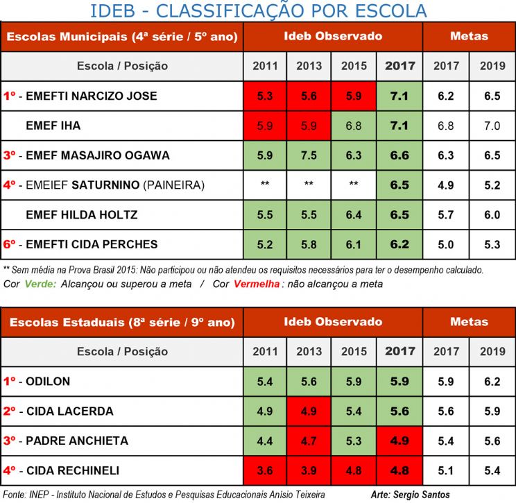 Escola Narcizo José surpreendeu e empatou com o Iha como as melhores da cidade. Destaques negativo para Anchieta e Rechineli que não alcançaram a meta do PNE