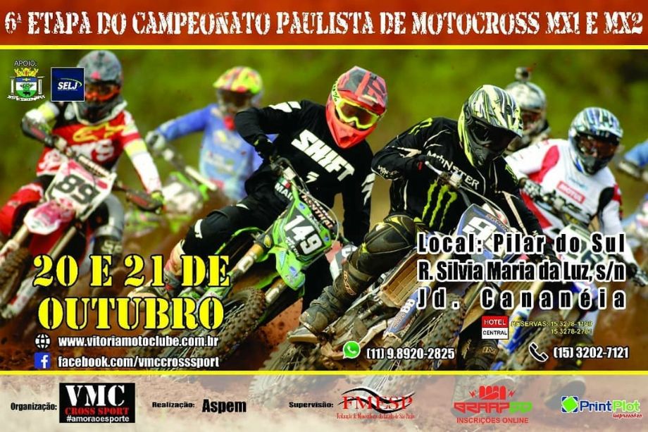 Pilar do Sul recebe nesse final de semana, dias 20 e 21 de outubro, a 6ª etapa do Campeonato Paulista de Motocross MX1-MX2, evento oficial da Federação de Motociclismo do Estado de São Paulo (FMESP), organizado pela Vitória Moto Clube Cross Sport e ASPEM (Associação de Pilotos de Enduro e Motocross de Pilar do Sul).
