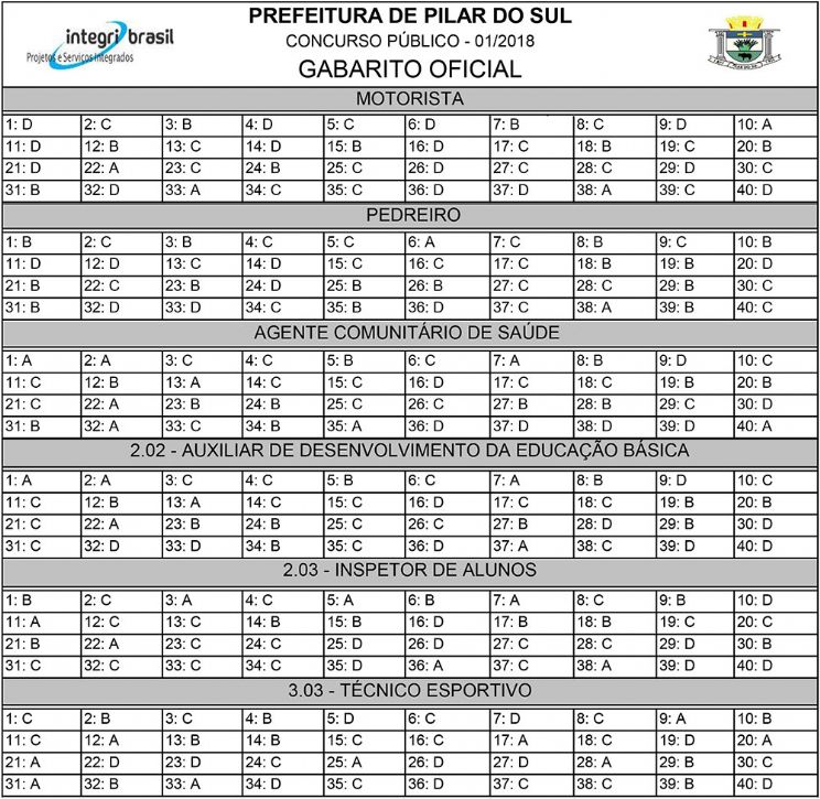 concurso público 01/2018 da Prefeitura Municipal de Pilar do Sul, divulgou na tarde desta segunda-feira (22) o gabarito oficial das provas objetivas para os cargos de motorista, pedreiro, auxiliar da educação, agentes de saúde, inspetor de alunos e técnico esportivo, aplicadas neste domingo, 21 de outubro.