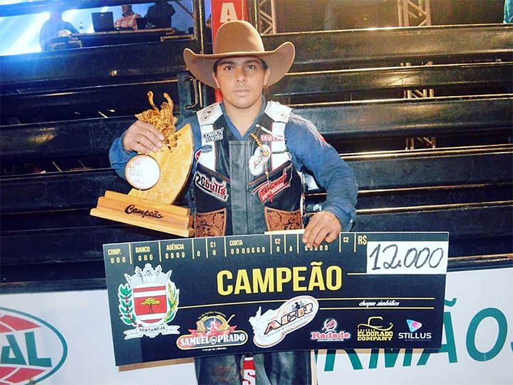 O competidor pilarense Fernando da Conceição, 28 anos, foi o grande campeão da 22ª Festa do Peão Boiadeiro de Sertaneja-PR, etapa da liga ACR (Associação de Campeões de Rodeio).