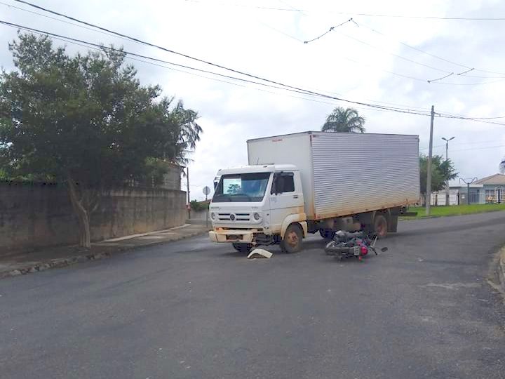 O condutor de uma motocicleta Honda CG 125 Fan ficou ferido após colidir contra um caminhão VW 8-150 por volta de meio dia deste domingo (17) no Jardim Campestre II.
