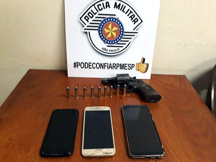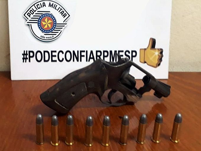 Durante a revista, os policiais localizaram no interior do carro um revólver calibre 38 e nove munições intactas e descobriram que as placas do veículo estavam adulteradas com fita isolante.